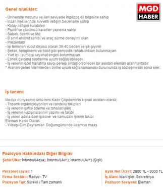 Radyocu ve televizyoncu Kadir Çöpdemir, internetten verdiği iş ilanı ile asistan aradığını duyurdu. İlandaki dikkat çekici detay ise asistanın beden ölçülerinin de aranılan şartlar arasında yer alıyor olması.